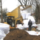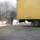 Die Entladung erfolgte von einem Schubboden LKW, der von der Straße rückwärts an die Baugrube gefahren war. Mit einem kleinen Bagger wurde die Schaumglasschüttung vom LKW ...